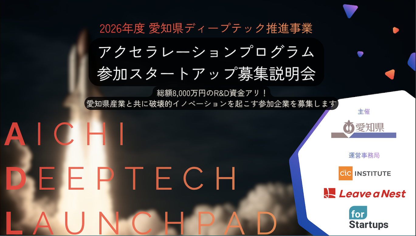CIC Instituteは株式会社リバネスおよびフォースタートアップス株式会社と共同で、愛知県ディープテック推進事業「Aichi Deeptech Launchpad」2026年度の支援対象の募集を開始します。