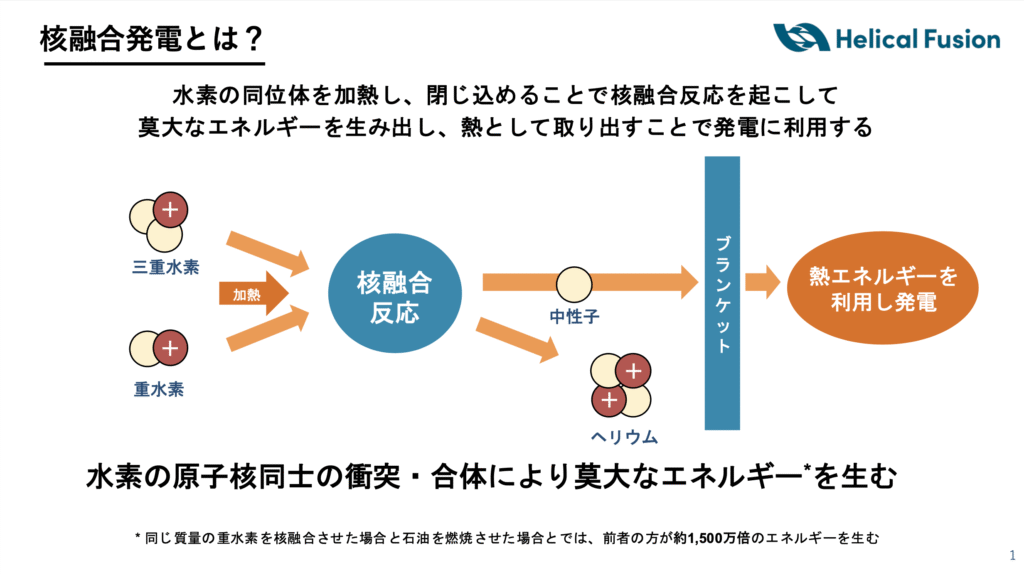 最近では“フュージョンエネルギー”と言うことが多いのですが、核融合エネルギーの社会実装を目指している会社です。「核融合」というのは、太陽や恒星の中で起こっている反応のことです。基本的な概念としては、軽い原子核が融合し、より重い原子核になる際に莫大なエネルギーを放出する原理を指します。我々は、その反応を地球上で人工的に再現し、それをエネルギー源、特に発電に使うことを目指しています。