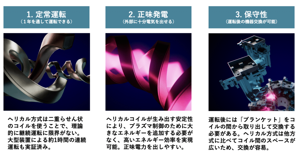 一年間ずっと動かせる、十分な電気を作れる、部品の交換が出来る、この三つの要件を今ある技術で実現可能なのは、「ヘリカル方式」を用いるヘリカル型核融合炉のみです。弊社の宮澤(CTO)、後藤(副CTO)はもともと別々の方式を研究していたのですが、どうしても三要件を満たせないと考えた末、ヘリカル方式にたどり着きました。他社に目を向けると、「これまで研究してきた方式をなんとか商用展開したい」という方向のアプローチも多い中、私たちはむしろ逆のアプローチで、この「三要件を満たしてちゃんと発電所として成立するのはどれなのか?」ということからスタートしてヘリカル方式に辿り着いています。